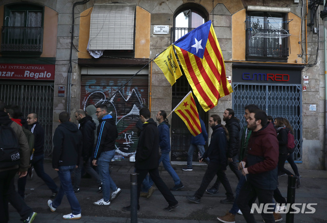 【바르셀로나=AP/뉴시스】21일(현지시간) 스페인 바르셀로나에서 카탈루냐 분리 독립 지지 시위대가 독립기를 들고 행진하고 있다.
