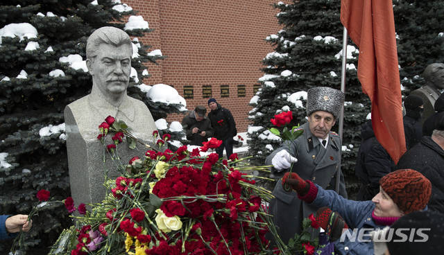 【모스크바=AP/뉴시스】21일(현지시간) 모스크바 붉은광장에서 이오시프 스탈린 구소련 공산당 서기장 탄생 139주년을 맞아 시민들이 스탈린의 묘에 헌화하고 있다.