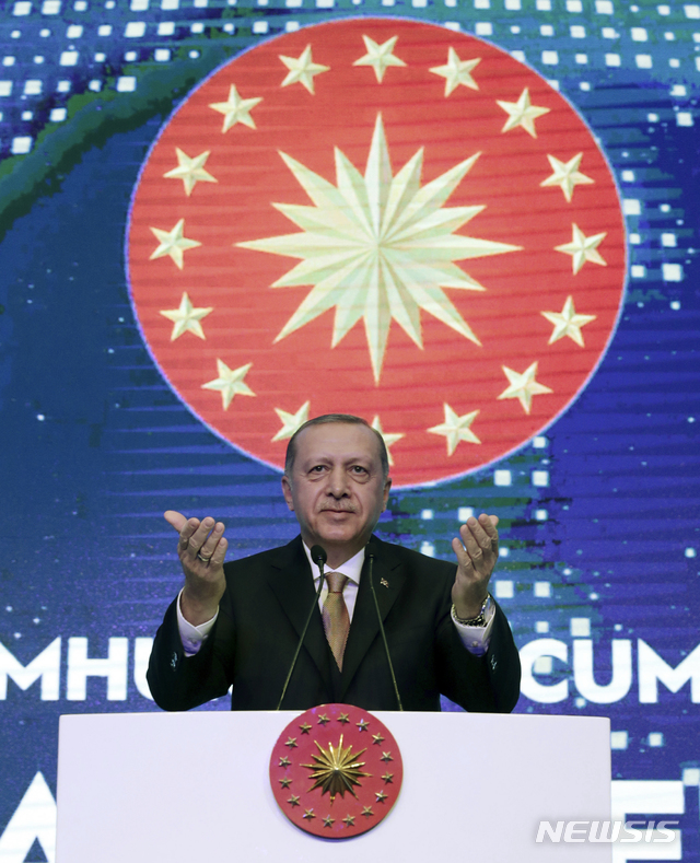【이스탄불=AP/뉴시스】레제프 타이이프 에르도안 터키 대통령이 21일(현지시간) 이스탄불의 한 비즈니스 회담에 참석해 연설하고 있다.