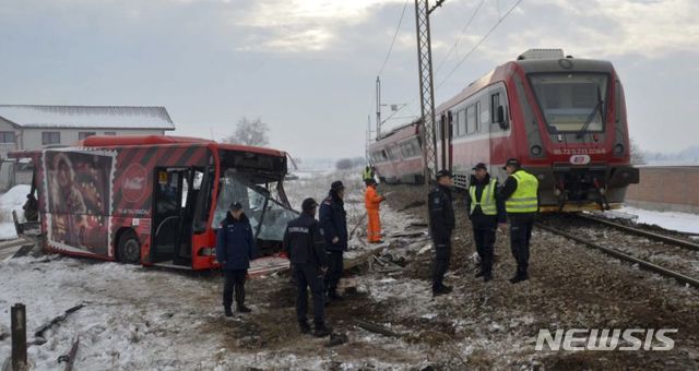 【니스(세르비아)=AP/뉴시스】세르비아 남부 도시 니스 인근 21일(현지시간) 고교생들을 태운 버스와 기차가 충돌해 최소 5명이 숨지고 30명이 다쳤다. 사고 현장에서 조사가 진행되는 모습.