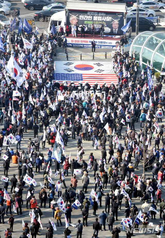 【대구=뉴시스】우종록 기자 = 22일 오후 대구 동구 신암동 동대구역 앞 광장에서 대한애국당 당원 등 참가자들이 ‘제99차 태극기 집회’에서 박근혜 전 대통령 석방을 촉구하며 태극기를 흔들고 있다. 2018.12.22.