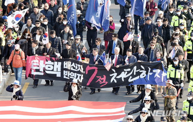 【대구=뉴시스】우종록 기자 = 22일 오후 대구 동구 신암동 동대구역 앞 광장에서 열린 ‘제99차 태극기 집회’에서 대한애국당 당원 등 참가자들이 박근혜 전 대통령 석방을 촉구하며 행진하고 있다. 2018.12.22.