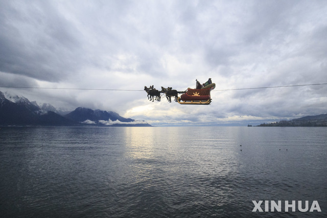 【몽트뢰=신화/뉴시스】22일(현지시간) 스위스 몽트뢰의 레만 호수 위에서 순록이 끄는 썰매 위 산타가 손을 흔들고 있다.