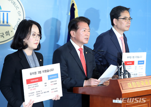 【서울=뉴시스】고승민 기자 = 국회 교육위원회 자유한국당 김한표(가운데) 간사, 김현아(왼쪽), 곽상도 의원이 23일 오후 서울 여의도 국회에서 유치원 3법 관련 기자회견을 하고 있다. 2018.12.23.