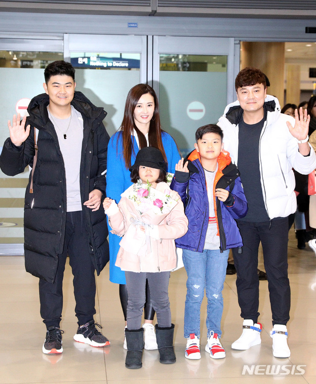 【인천공항=뉴시스】이영환 기자 = 미국 메이저리그 텍사스 레인저스 추신수가 부인 하원미 씨, 아들 추무빈 군, 추건우 군, 딸 추소희 양과 23일 오후 인천국제공항 제1여객터미널을 통해 귀국하고 있다. 2018.12.23.