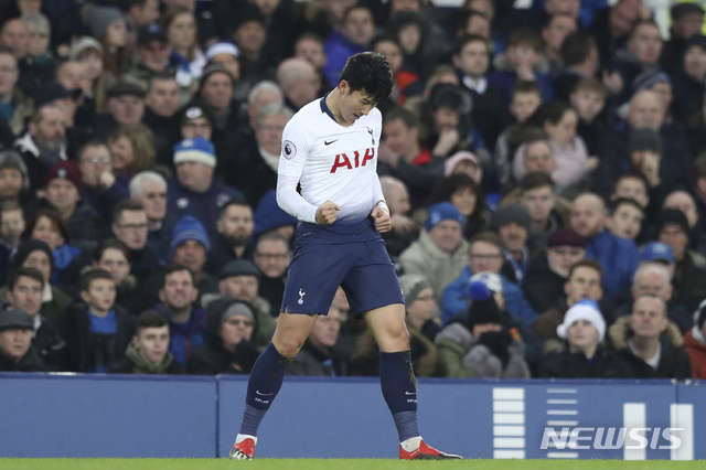 【리버풀=AP/뉴시스】토트넘의 손흥민이 23일(현지시간) 영국 리버풀의 구디슨 파크에서 열린 에버턴과의 2018-2019 잉글랜드 프리미어리그 18라운드 원정 경기에서 골을 넣고 자축하고 있다.