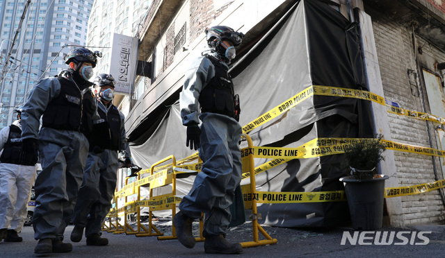 【서울=뉴시스】이영환 기자 = 24일 오전 서울 강동구 천호동 성매매업소 화재 현장에서 경찰과 소방당국, 국립과학수사연구원, 한국전력 등 관계자들이 2차 합동 감식을 하고 있다.