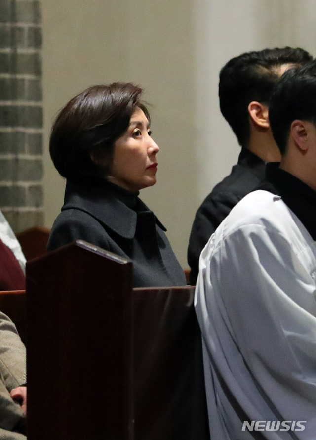 【서울=뉴시스】배훈식 기자 = 나경원 자유한국당 원내대표가 25일 오전 서울 중구 명동성당에서 성탄 전야 미사를 하고 있다. 2018.12.25.