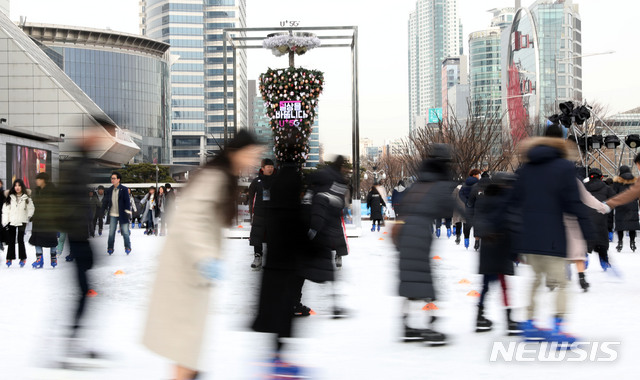 【서울=뉴시스】홍효식 기자 = 크리스마스인 25일 오전 서울 강남구 코엑스 일대에서 열린 '2018 코엑스 겨울축제'에서 시민들이 아이스링크를 타고 있다. 2018.12.25.