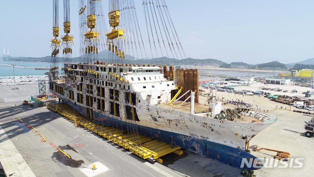 【목포=뉴시스】류형근 기자 = 5월 10일 오후 전남 목포시 목포신항에서 현대삼호중공업 관계자들이 옆으로 누워 있는 세월호 바로 세우기(직립) 작업을 진행하고 있다. 2018.12.26.