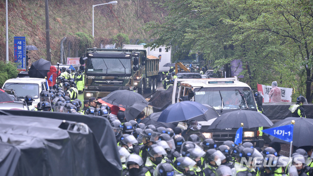 【성주=뉴시스】우종록 기자 = 4월 23일 오전 경북 성주군 초전면 소성리 진밭교 앞에서 경찰의 호의 속에 주한미군 사드(THAAD·고고도미사일방어체계) 기지의 생활공간 개선을 위한 건설장비와 자재 차량이 기지로 이동하고 있다. 2018.12.26.