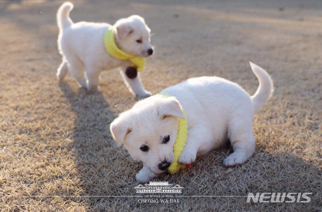 이날 청와대는 공식 SNS(소셜네트워크서비스)를 통해 "여섯 마리의 풍산개 강아지들은 잘 지내고 있다"며 "하루가 다르게 쑥쑥 자라서 이제는 관저 앞 잔디밭을 뛰어다니고 하얀 이도 제법 나서 이갈이를 하는지 물기를 좋아한다"고 전했다. 2018.12.25. (사진=청와대 페이스북)