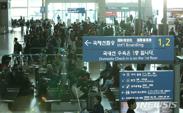 【인천공항=뉴시스】이윤청 수습기자 = 26일 오후 인천국제공항 제1터미널에서 시민들과 관광객들이 탑승수속을 위해 대기하고 있다.
