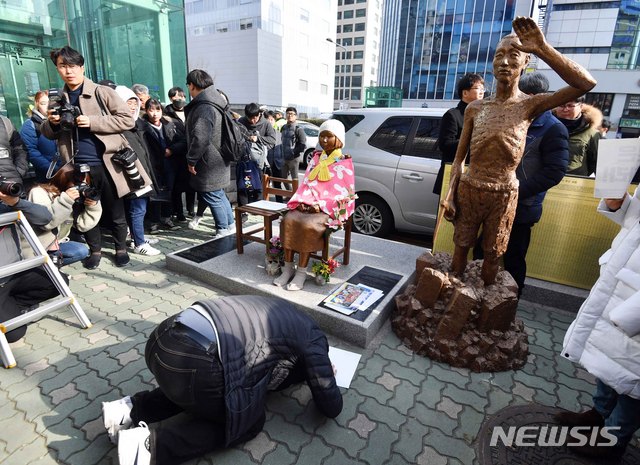 【부산=뉴시스】 하경민 기자 = 26일 부산 동구 일본총영사관 앞 평화의 소녀상에 옆에 강제징용노동자상 모형이 설치되자 한 시민단체 참가자 큰절을 하고 있다. 2018.12.26.
