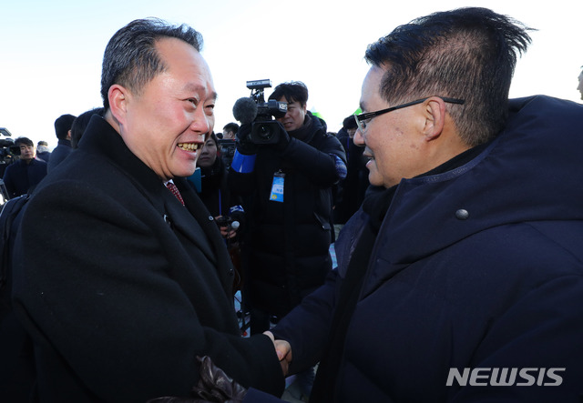 【개성=뉴시스】배훈식 기자 = 26일 오전 북한 개성시 판문역에서 열린 남북 동서해선 철도, 도로 연결 및 현대화 착공식에 참석한 박지원(오른쪽) 의원이 리선권 북한조국평화통일위원장과 악수하고 있다. 2018.12.26