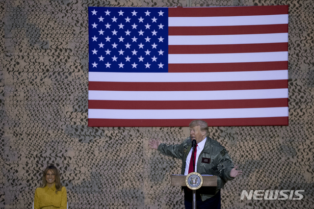 【바그다드(이라크)=AP/뉴시스】26일(현지시간) 이라크 주둔 미군 기지를 깜짝 방문한 도널드 트럼프 대통령이 알아사드 공군기지에서 연설하고 있다.