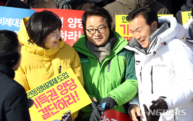 【서울=뉴시스】이종철 기자 = 27일 서울 여의도 국회 본청 계단에서 열린 야3당 연동형 비례대표제 도입 촉구 및 기득권 양당 규탄대회에 참석한 미래당 손학규(오른쪽부터) 대표, 평화당 정동영 대표, 정의당 이정미 대표가 대화하고 있다. 2018.12.27.