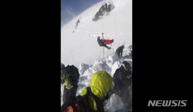 【프랑스=AP/뉴시스】27일(현지시간) 프랑스의 프랑스 알프스에서 산사태가 일어나 눈에 깔려 있던 한 소년이 헬기로 구조되고 있다.