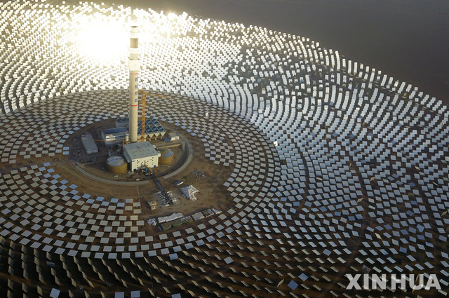 【둔황=신화/뉴시스】25일(현지시간) 중국 간쑤성 둔황의 용융염(molten salt) 태양열 발전소의 일부 모습이 장관을 연출하고 있다.