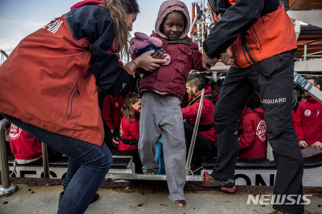 【알헤시라스=AP/뉴시스】지난 21일(이하 현지시간) 지중해에서 구조돼 스페인의 NGO 단체 '프로악티바 오픈 암스' 구조선으로 28일 스페인 알헤시라스 항에 도착한 한 이주 어린이가 배에서 내리고 있다.