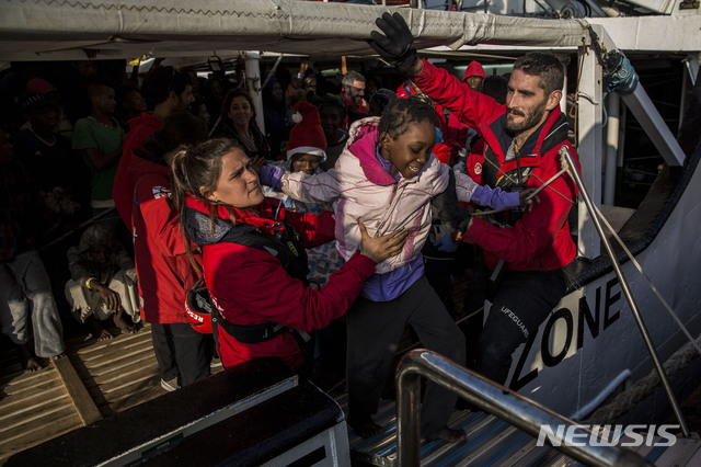 '프로악티바 오픈 암스' 구조선은 지난주 리비아 인근 바다에서 이주자 313명을 구조했으나 인근 국가들의 입항 거부로 긴 항해 끝에 이날 스페인 남부 알헤시라스 항에 정박했다. 2018.12.28.