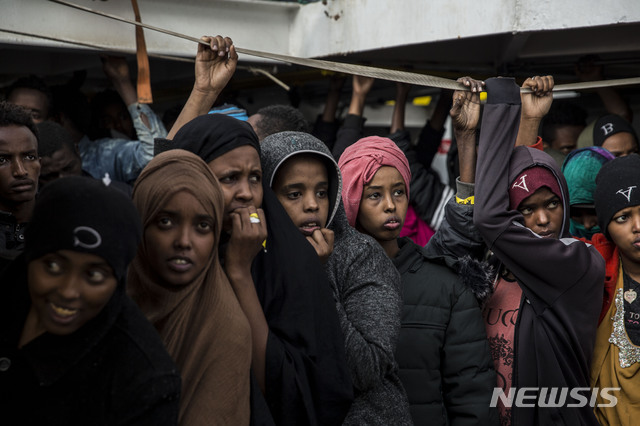 【알헤시라스=AP/뉴시스】지난 21일(이하 현지시간) 지중해에서 구조돼 스페인의 NGO 단체 '프로악티바 오픈 암스' 구조선으로 28일 스페인 알헤시라스 항에 도착한 이주민들이 불안감과 호기심 어린 표정으로 항구를 바라보고 있다.