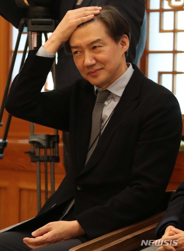 【서울=뉴시스】전신 기자 = 조국 대통령비서실 민정수석비서관이 28일 오전 청와대 본관 접견실에서 열린 김상환 신임 대법관 임명장 수여식에 참석해 식 시작을 기다리고 있다. 2018.12.28.