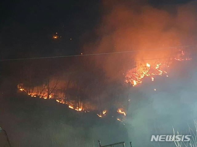 【삼척=뉴시스】김태식 기자 = 28일 오후 8시43분께 강원 삼척시 미로면 하정리에서 발생한 산불이 강풍을 타고 확산되고 있다.2018.12.29.(사진=권정복 삼척시의원)