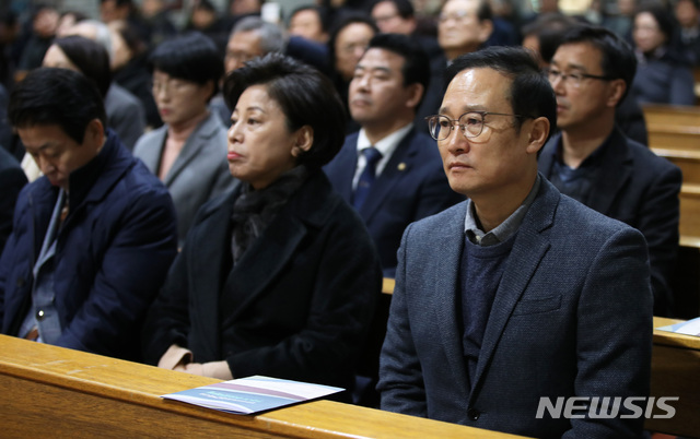 【서울=뉴시스】이윤청 수습기자 = 더불어민주당 홍영표(오른쪽 첫번째) 원내대표와 남인순(가운데) 의원이 29일 오전 서울 도봉구 창동성당에서 열린 민주주의자 고 김근태 선생 7주기 추도미사에 참석해 있다. 2018.12.29.