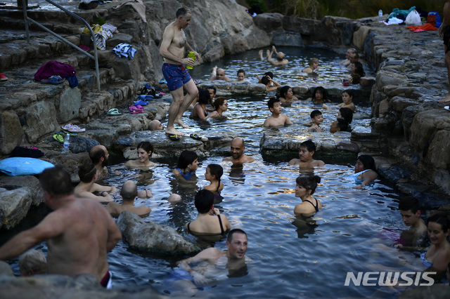 【아르네디요=AP/뉴시스】29일(현지시간) 스페인 북부 아르네디요 마을에서 추운 겨울 아침임에도 불구하고 관광객들이 노천 온천을 즐기고 있다.