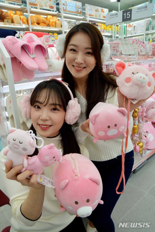 【서울=뉴시스】31일 오전 서울 다이소 홍대 2호점에서 모델들이 다이소 황금돼지 시리즈를 소개하고 있다.