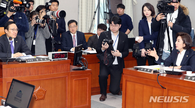 【서울=뉴시스】이종철 기자 = 청와대 특별감찰반의 민간인 사찰 의혹과 관련해 31일 서울 여의도 국회에서 열린 국회 운영위원회 전체회의에서 한국당 나경원 원내대표가 임종석 비서실장과 조국 민정수석의 업무보고와 관련하여 홍영표 운영위원장에게 항의를 하고 있다. 2018.12.31.