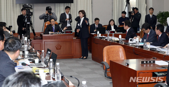 【서울=뉴시스】박영태 기자 = 31일 서울 영등포구 여의도 국회에서 열린 국회 운영위원회 오후 전체회의에서 홍영표 운영위원장이 나경원 자유한국당 원내대표와 설전을 벌이고 있다. 2018.12.31.