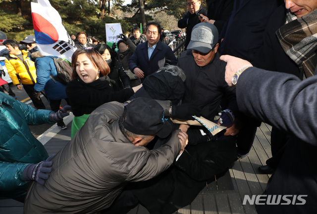【서울=뉴시스】고승민 기자 = 정체불명의 '태극기 부대' 무리가 1일 오전 국립서울현충원 김대중 전 대통령 묘소 앞에서 '빨갱이' 등 고성을 지르며 따뜻한 차를 마련해 자원봉사 중인 민주평화당 당원들에게 시비를 걸고 있다. 2019.01.01.