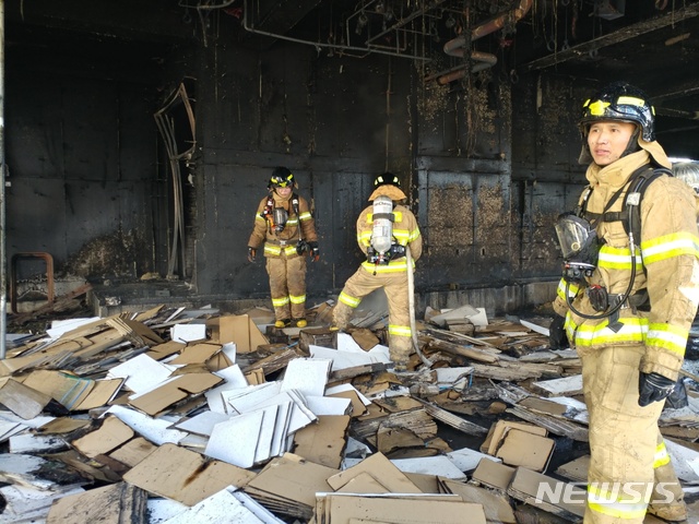 【천안=뉴시스】이종익 기자 = 3일 오전 9시32분께 충남 천안시 서북구 차암동 차암초등학교 1개동(연면적 1만2786㎡)에 3층 15개 학급 교실 증축 공사 현장에서 화재가 발생해 천안서북소방서 소방대원들이 화재진압 후 현장을 조사하고 있다. 2019.01.03.