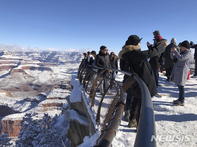【그랜드캐년=AP/뉴시스】1일(현지시간) 미 애리조나주 그랜드캐년 국립공원 사우스림에 눈이 쌓여 관광객들이 사진을 찍고 있다.