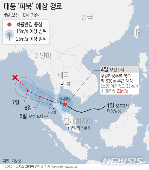 【서울=뉴시스】안지혜 기자 = 기상청에 따르면 올해 1호 태풍 파북(PABUK)은 4일 오전 9시 말레이시아 쿠알라룸푸르 북쪽 약 530㎞ 부근 해상에서 시간당 33㎞ 속도로 북서진 중이다. (강도 '약', 크기 '소형')