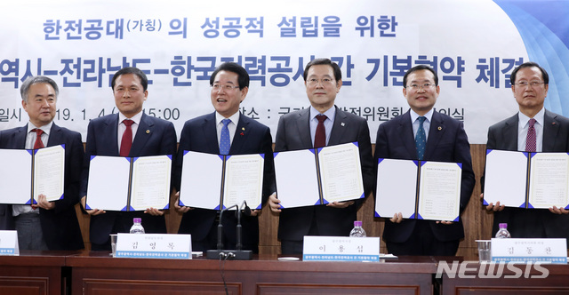 왼쪽부터 송재호 국가균형발전위원회 위원장, 이용재 전라남도의회의장, 김영록 전라남도지사, 이용섭 광주광역시장, 김동찬 광주광역시의회 의장, 김종갑 한국전력공사 사장. 2019.01.04.