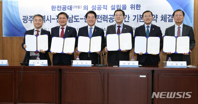 【서울=뉴시스】박미소 수습기자 = 4일 오후 서울시 종로구 정부서울청사 국가균형발전위원회 대회의실에서 열린 한전공대(가칭) 설립을 위한 광주광역시-전라남도-한국전력 간 기본협약서 체결식에서 참석자들이 협약서를 들고 기념촬영을 하고 있다.