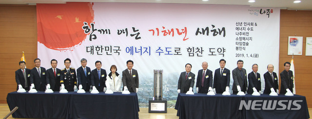 이날 행사에는 강인규 나주시장, 김선용 시의회의장, 조영탁 전력거래소 이사장, 박성수 광주전남연구원장, 이종옥 한국농어촌공사 부사장, 김성윤 한전상생협력 본부장, 문채주 에너지밸리산학융합원장, 여성구 에너지밸리기업개발원장 등 에너지 분야 산·학·연 기관장(대표)들이 대거 참석했다. 2019.01.04 (사진=나주시 제공)