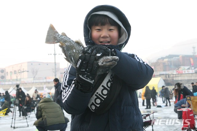 【화천=뉴시스】박종우 기자 = 대한민국 겨울 대표축제인 2019 얼음나라 화천 산천어축제장 개막일인 5일 강원 화천군 화천읍 화천천 축제장 얼음낚시터에서 한 아이가 처음으로 산천어를 잡아 기뻐하고 있다. 2019.01.05
