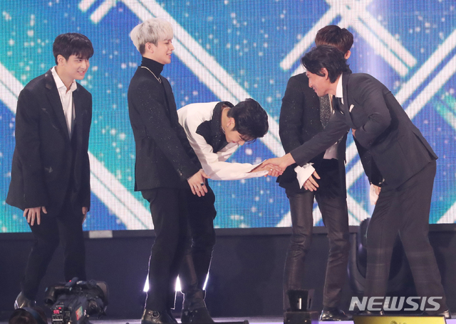 【서울=뉴시스】최진석 기자 = 5일 오후 서울 구로구 고척스카이돔에서 열린 '제33회 골든디스크어워즈-음원부문'시상식에서 그룹 아이콘이 디지털 음원부문 대상으로 선정된 후 시상자 황정민의 축하를 받고 있다. 2019.01.06. (사진=골든디스크 특별취재단 제공)
