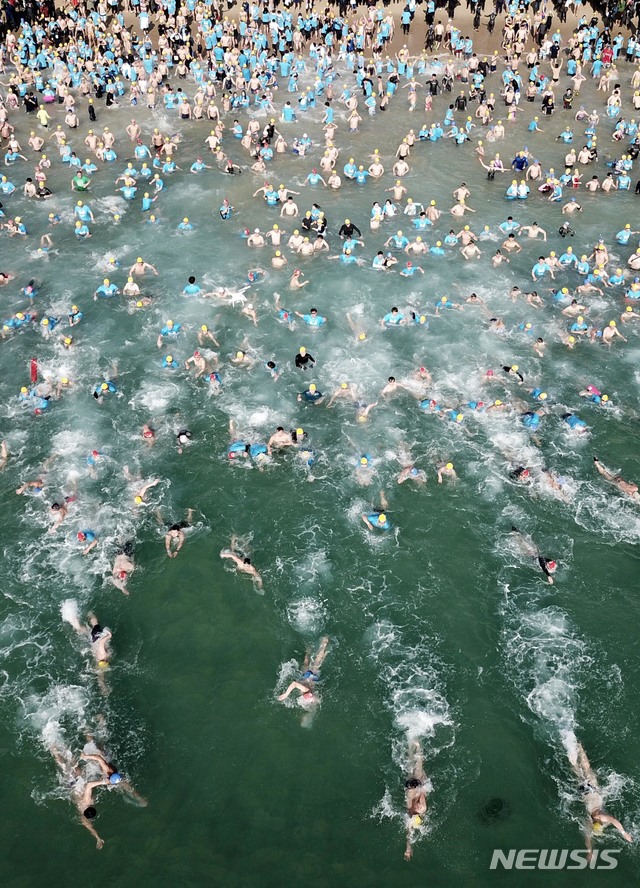 【부산=뉴시스】 하경민 기자 = 6일 부산 해운대해수욕장에서 열린 '제32회 해운대 북극곰 축제'에 참가한 시민과 관광객 등 인간 북극곰 수천 명이 일제히 차가운 겨울바다에 뛰어들고 있다. 2019.01.06. (사진=부산일보 제공)