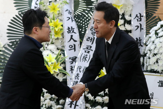 【서울=뉴시스】추상철 기자 = 오세훈 자유한국당 국가비전미래특별위원회 위원장 부친의 빈소가 마련된 6일 오후 서울 송파구 서울아산병원 장례식장에서 오 위원장이 조문객을 맞이하고 있다. 2019.01.06.