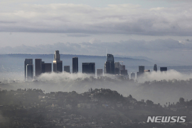 【로스앤젤레스 = AP/뉴시스】 캘리포니아 산불 지역에 내린 폭설과 폭우로 진흙 산사태가 일어나 해안 고속도로 일부가 차단되고 샌프란시스코 국제공항은 강풍으로 항공기 운항에 차질을 빚었다. 사진은 6일 두터운 비구름층 위로 솟아있는 로스앤젤레스 시내 고층 건물들. 2019.01.07