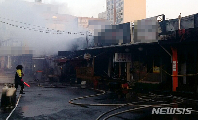 【목포=뉴시스】변재훈 기자 = 7일 오전 6시29분께 전남 목포시 산정동 중앙시장 내 식당가에서 불이 나 소방당국에 의해 1시간10여분 만에 꺼졌다. 이 불로 13개 점포가 탔으나 인명피해는 없었다. 2019.01.07.(사진=전남 목포소방서 제공)