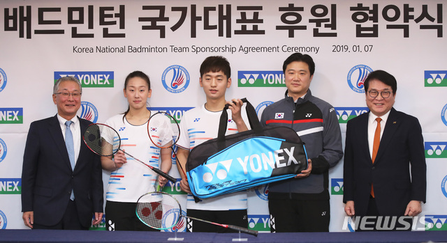 왼쪽부터 요넥스 쿠사키 하야시다 사장, 배드민턴국가대표 이소희, 최솔규 선수, 안재창 감독, 동승통상 김철웅 사장. 2019.01.07.