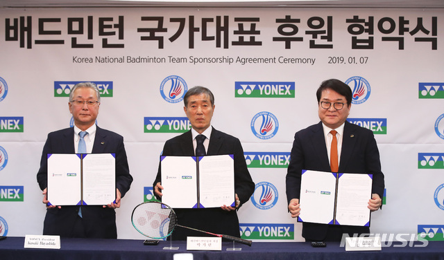 【서울=뉴시스】이윤청 수습기자 = 7일 오후 서울 송파구 올림픽파크텔에서 열린 대한배드민턴협회·요넥스 배드민턴국가대표 후원협약식에서 요넥스 쿠사키 하야시다(왼쪽부터) 사장, 대한배드민턴협회 박기현 회장, 동승통상 김철웅 사장이 협약서에 사인을 한 후 기념촬영을 하고 있다. 2019.01.07.
