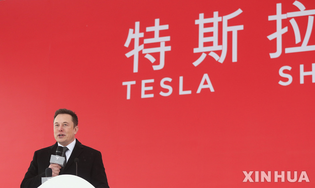 【상하이=신화/뉴시스】엘론 머스크 테슬라 CEO가 7일(현지시간) 중국 상하이에서 테슬라 상하이 기가팩토리 착공식에 참석해 연설하고 있다.