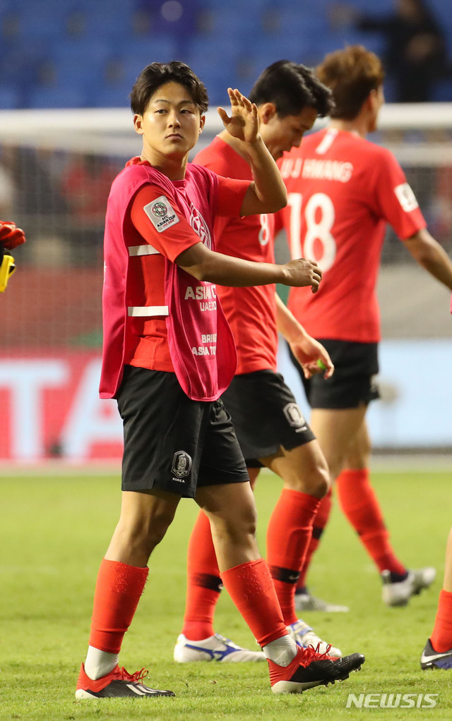 【두바이(아랍에미리트)=뉴시스】김진아 기자 = 7일 오후(현지시각) 아랍에미리트 두바이 알막툼 경기장에서 열린 2019 AFC 아시안컵 C조 조별 리그 1차전 한국과 필리핀의 경기, 한국이 1:0으로 승리하자 이승우가 관중석을 바라보고 인사하고 있다. 2019.01.08.